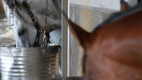 並んでお食事中のゴールドシップとジャスタウェイ(提供:榎本優也調教助手)